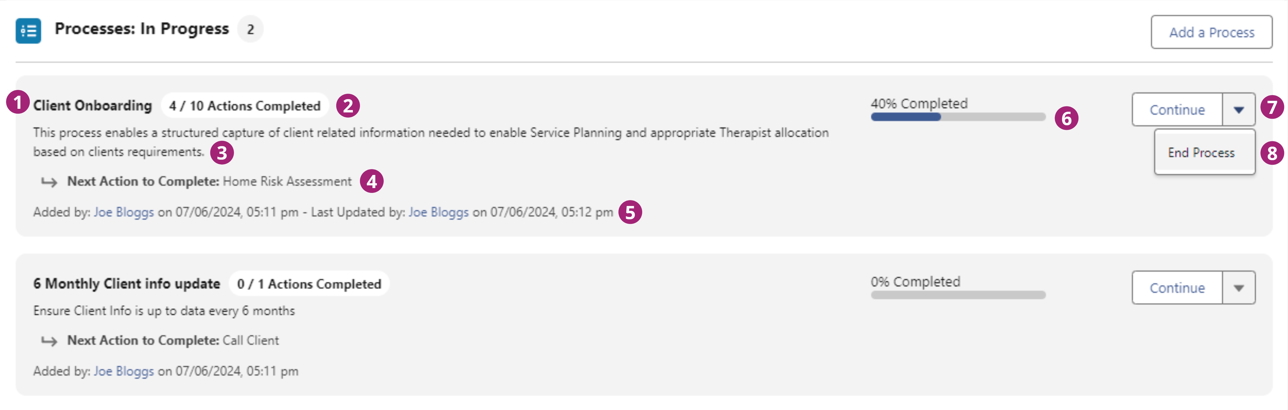 Multiple processes can be added to a worker . For example, if you are onboarding a Worker while simultaneously conducting a process for Incident Management, you can add two separate 'In Progress' processes for each against the Worker.